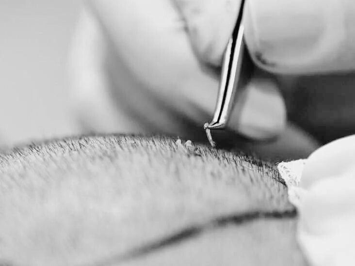 El cierre de la herida, se realiza mediante puntos de sutura ordinaria o tricofítica, lo que supone una cicatriz lineal más evidente, por lo que pacientes que lleven el cabello muy corto se podrá ver la cicatriz en la parte posterior de la cabeza (área donante.).