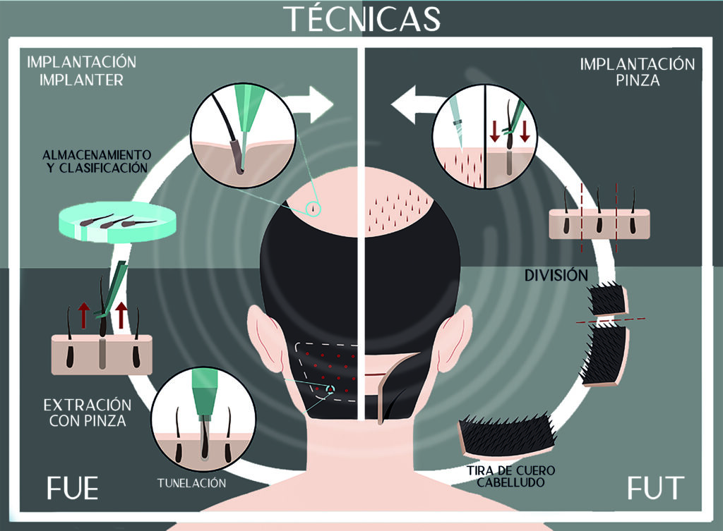 Existen dos técnicas para realizar la extracción: la técnica de la tira o técnica FUSS ( Follicular Unit Transplantation) y la técnica FUE (Folicular Unit Extraction).